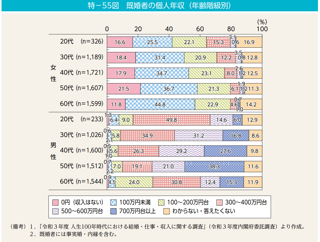 - 20代の既婚男性の約半数が年収300万円から499万円の間に位置しています。